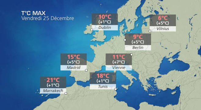 A contrario, entre des conditions anticycloniques sur le Groenland et dépressionnaires sur la Mer de Norvège, l’Islande connaît un Noël au tison avec de fortes chutes de neige et du vent de Nord d’origine polaire. Ainsi, le thermomètre affiche des niveaux inférieurs de 5 à 10°C par rapport aux moyennes de saison. Hormis les contrées du grand nord Arctique, c'est l’une des destinations les plus froides de ce Noël 2015 qui partout ailleurs se déroule sous une grande douceur. Celle-ci reste très marquée de la péninsule ibérique à l'Autriche et aux pays baltes ainsi qu'en Russie où la température a atteint 10°C hier à Moscou, constituant un record pour une veille de Noël.