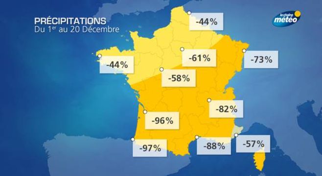 Les cumuls de pluie ne dépassent pas 3 millimètres sur les plaines du sud-ouest, ce qui place pour l'instant ce mois de décembre comme le mois le plus sec depuis le milieu du XXème siècle. Des records de faible pluviométrie pourraient aussi être battus dans le centre-est avec seulement 2 mm au Puy-en-Velay, 4 mm à Bourg-Saint-Maurice, 5 mm à Grenoble et 7 mm à Lyon.
