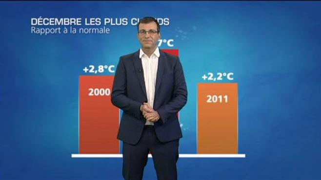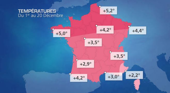 Après un mois de novembre déjà très doux avec un excédent de 2,5°C, ce mois de décembre est bien parti pour être le plus chaud jamais enregistré depuis le début du XXème siècle au moins. Avec un excédent de 3,7°C sur les 20 premiers jours du mois, il se place pour le moment au premier rang des mois de décembre les plus chauds depuis le milieu du XXème siècle au moins. C'est sur les régions proches de la Manche que l'excédent est le plus marqué puisqu'il atteint 5°C sur des villes comme Lille et Brest. C'est sur l'extrême sud-est et la Corse que l'excédent thermique est le plus faible avec seulement 2°C sur Ajaccio et Nice.