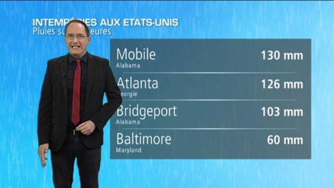 Les mêmes régions, en plus de la Floride, de l’Ohio, et de la Géorgie, restent concernées par le risque d’orages violents jusqu’au week-end. Des vents destructeurs, des pluies soudaines et fortes, et des tornades, peuvent à nouveau se produire sous les orages et provoquer des inondations.