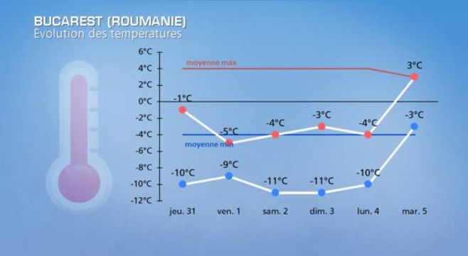 Dans le courant de la semaine du 4 au 10 janvier, le froid glacial se maintiendra sur les Balkans, la Roumanie, la Grèce et la Turquie et devrait s'estomper sur place. Mais, en fonction du dynamisme de cette masse d'air, le froid pourrait progresser plus vers l'ouest, vers l'Italie, et provoquer des chutes de neige en mer Adriatique.