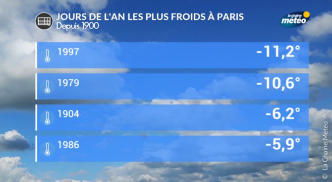 Le 1er janvier 1971 a été l’un des plus froids du 20ème siècle en France avec -19°C à Strasbourg, -11°C à Lyon, - 9,3°C à Toulouse et -6°C à Biarritz. Les jours de l’An sans dégels restent rares en plaine. On en compte quatre à Paris entre 1900 et 2016, deux à Toulouse depuis 1927 et huit à Strasbourg depuis 1942. A Paris, le dernier date de 2002 où la maximale n’a pas dépassé -1,1°C. La vague de froid de décembre 1996 et janvier 1997 a également été l'une des plus rigoureuses dans le nord de la France. Le 1er janvier, la température n’a pas dépassé -7,8°C à Paris et -9,8°C à Strasbourg.