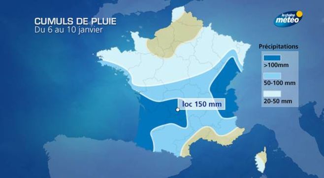 La perturbation s’étire le matin de l’Aquitaine et du nord de Midi-Pyrénées aux régions situées au nord de la Seine. Les pluies sont modérées à localement fortes, notamment entre le Limousin, le Lot et la Dordogne. Il neige sur les hauteurs du Massif Central mais la limite pluie-neige remonte rapidement, au-delà de 1500 mètres. Les pluies gagnent dans la matinée la région Rhône-Alpes dans son ensemble, jusqu’aux confins du Languedoc et de l’arrière-pays provençal.