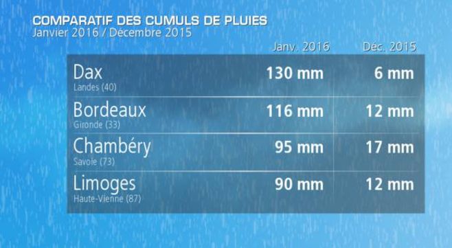 La France a connu un mois de décembre très sec. Depuis le début de l’année 2016, la situation a radicalement changé avec de nombreux passages pluvieux.