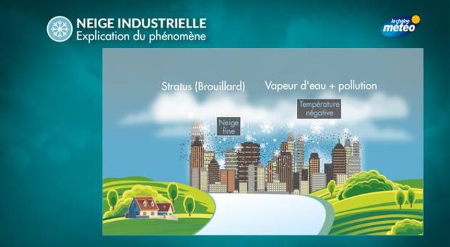 Il s’agit avant tout d’une neige émanant des activités industrielles conjuguée à des brouillards givrants. Ce phénomène a lieu principalement par temps calme et le plus souvent anticyclonique. Avec les températures négatives présentes dans le nord-est, les chauffages urbains et les cheminées des foyers en banlieue ont participé à l’augmentation des émissions en particules. Ces polluants atmosphériques stagnant au-dessus des agglomérations constituent des noyaux de condensation qui, par temps froid, atteignent le seuil de la congélation. La vapeur d’eau présente naturellement dans l’air se condense sur les particules polluantes et gèle, formant peu à peu des flocons de neige qui finissent par tomber.