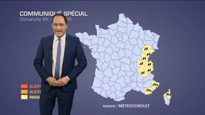 Cet après-midi, les pluies les plus fortes se maintiendront du Luxembourg au nord des Alpes. Des Vosges au Jura puis en Savoie et Haute-Savoie, les cumuls atteindront entre 60 et 90 mm, soit l'équivalent de quinze jours de précipitations. Dans les Alpes du Nord, il neigera abondamment au-dessus de 2000 mètres, ce qui accentuera le risque d'avalanche. Des Pyrénées à la Côte d'Azur ainsi qu'en Corse, le temps sera plus lumineux malgré des passages nuageux. Mais le mistral et la tramontane se renforceront avec des rafales atteignant 100 à 110 km/h entre la Provence et les Alpes Maritimes ainsi que sur les Corbières. En Corse, une véritable tempête est annoncée avec des rafales approchant les 140 à 150 km/h sur les caps exposés.
