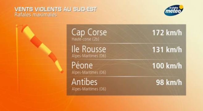 Aujourd'hui, les régions méditerranéennes sont à leur tour concernées par des vents très forts (voir notre communiqué spécial). Une tempête se produit sur la Corse avec des rafales à plus de 170 km/h sur les caps et côtes exposés. Sur la côte d’Azur, les rafales ont frôlé les 100 km/h entre Toulon et Antibes ce matin. Enfin en Roussillon, la Tramontane va souffler violemment sur le massif des Corbières avec des rafales approchant les 110 km/h ce soir. Le vent se calmera progressivement dans la nuit.