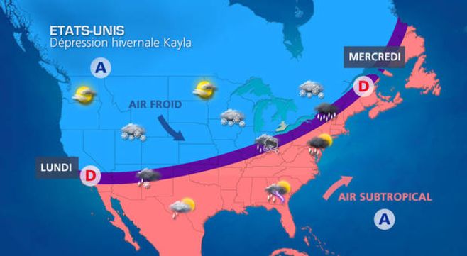 Cette dépression frappe la Californie ce lundi. Elle provoque de fortes pluies près du littoral et d’abondantes chutes de neige au-dessus de 1000 mètres d’altitude. Mardi, les Rocheuses seront à leur tour impactées par ce phénomène. Mercredi et jeudi prochain, Kayla traversera les Grandes Plaines puis la région des Grands Lacs avant de terminer sa course sur le Québec. A son passage un véritable blizzard est attendu avec des vents violents entre le Nebraska, du Dakota et le Minnesota. Sur le Kansas, le Nebraska, l'Iowa et le Wisconsin, les épaisseurs de neige pourront atteindre 20 cm.