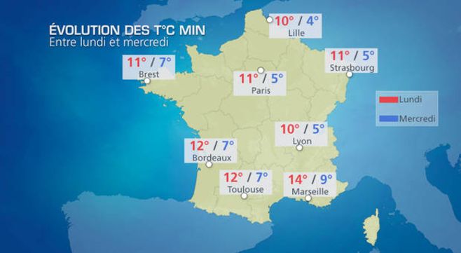 Au cours des deux prochains jours, nos services prévoient une baisse des températures, notamment mercredi avec l'arrivée d'air plus froid en provenance des Iles Britanniques.
