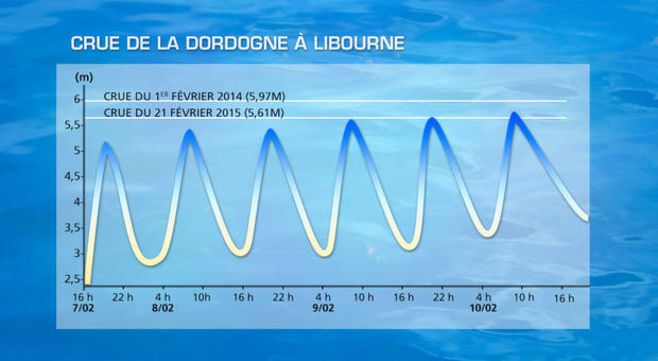 A Libourne la cote du 1er février 2014 a été dépassée ce matin sur la Dordogne avec 6,06 m. Nous ne sommes plus qu'à 30 cm de la crue de décembre 1999.