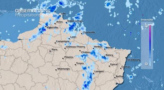Les conditions se dégradent entre le Pays de Caux, la Somme, la Thiérache et le Nord-Pas-de-Calais. Les averses se multiplient et se renforcent dans ces secteurs, et en particulier dans l'Avesnois où il s'agit de neige tenant au sol, avec des températures de -1°C à Saint-Hilaire-sur-Helpe (59) et 0°C à Valenciennes (59). On relève d'ailleurs 1 à 2 cm de neige entre l'Avesnois et la Sambre (secteur d'Hautmont et d'Avesnes-sur-Helpe). Ces températures ont par ailleurs tendance à baisser au passage des fortes averses. Ainsi, dans le Calaisis, la température est passée de 2°C à 0°C entre 4h et 5h, sous des intensités d'averses modérées à assez fortes qui se sont désormais transformées en neige seule. Des averses modérées circulent également de la Seine-Maritime vers l'Oise ainsi que de la Somme vers l'Aisne.