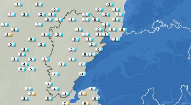 Quelques giboulées de neige persistent de l'Avesnois à l'Aisne et de l'Yonne à la Lorraine. Elles sont sans conséquence puisque les températures sont redevenues positives, affichant de 2 à 5°C sous abri. C'est toujours en Franche-Comté que la situation est la plus dégradée avec des chutes de neige d'intensité modérée au-dessus de 300 mètres d'altitude. En plaine, il s'agit d'un mélange de pluie et de neige mêlées. Les températures oscillent entre 0 et 2°C.