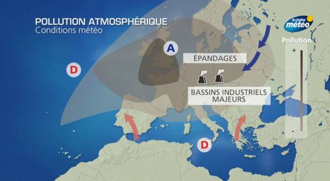 C’est par le nord de la France que cette pollution aux particules débute. La présence des hautes pressions explique cette répartition. Le faible flux d’est contribue également à l’augmentation des niveaux de particules fines sur le nord de la France. Il apporte une masse d’air déjà chargée en polluants en provenance des bassins industriels de l‘Europe centrale et de régions où les épandages agricoles ont repris. Les polluants émis par les agglomérations françaises se rajoutent à ceux contenus initialement dans la masse d’air.