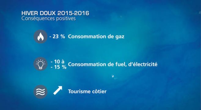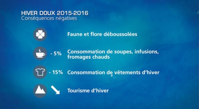 La douceur des températures a eu des conséquences sur nos habitudes de consommation. On a consommé moins de légumes d'hivers, de fromages chauds, de soupes et de tisanes. Les ménages français qui se chauffent au bois en ont moins consommé ce qui pénalise la filière bois de chauffage après deux hivers doux consécutifs.