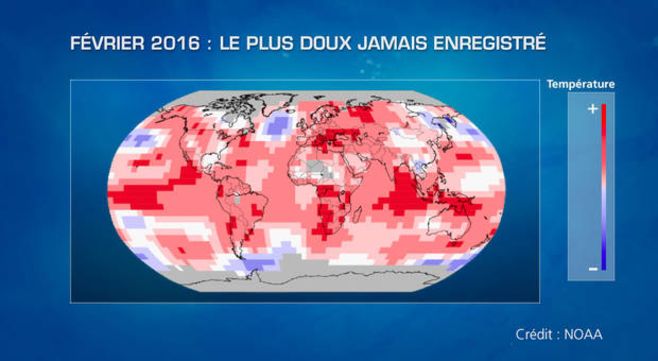 Selon l'Agence américaine NOAA, février 2016 est le mois de février le plus chaud observé depuis 1880 avec un excédent de températures de 1,21°C par rapport à la moyenne calculée sur le XXème siècle.
