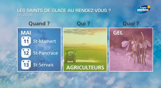 Jusqu'à début juin, le risque de gel est parfois possible lors de nuits pleinement dégagées. Les Saints de glace 2015 (11, 12 et 13 mai) s'étaient transformés en saints de chaleur l'année dernière, avec des records battus le 13 mai 2015 dans le centre-est (34°C à Saint-Etienne).