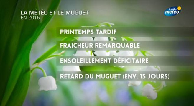 Avec un déficit de températures de 1°C au cours des mois de mars et avril, on observe un retard d'une quinzaine de jours du fleurissement du muguet sauvage qui est trop précoce pour les cueilleurs de ce 1er mai. Les gelées de la fin du mois d'avril ont encore aggravé sa croissance. En conséquence, le muguet est plus cher cette année (1,50 euros le brin) mais vous le conserverez plus longtemps puisqu'il mettra plus de temps à éclore.