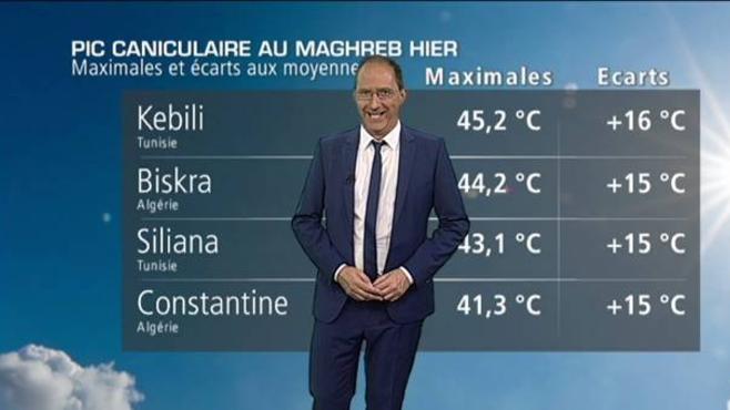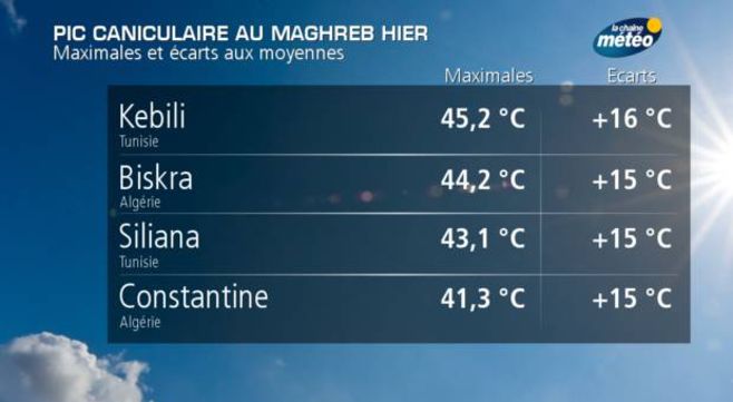 Un épisode de très fortes chaleurs concerne depuis jeudi l'est de l'Algérie et la Tunisie. Hier, le thermomètre a grimpé à 45°C dans le centre de la Tunisie et le nord de l'Algérie.