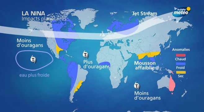 Comparable à un jeu de domino, les effets de El Nino et de la Nina se répercutent à l'échelle planétaire en plusieurs mois car le changement de température de l'eau modifie le sens des vents et la circulation atmosphérique au-dessus de la zone intertropicale. Ces changements influencent aussi le "jet stream" (grands vents qui font le tour de la planète) et chamboulent la distribution des masses d'air.