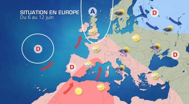 Dans l'ouest, il fera beau, grâce à la proximité de l'anticyclone des Açores. Les régions de l'est se trouveront dans un marais barométrique, ce qui favorisera le déclenchement des orages.