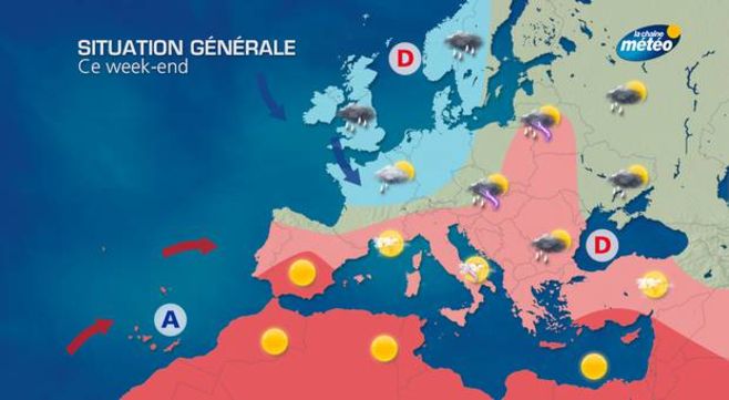Ce samedi, le vent orienté à l'ouest et d'influence océanique maintient des températures en-dessous des normales de saison. Le matin, il fait de 10 à 23°C du nord-ouest au sud-est. L'après-midi, on partira de 17°C près de la Manche à 30 ou 32°C sur les rivages de la Méditerranée. Dimanche, les températures seront en hausse sensible avec des valeurs affichant de 18 à 23°C au nord et de 23 à 33°C dans les régions méridionales.