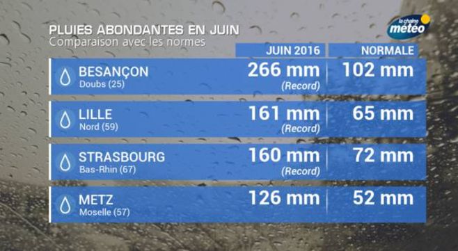 La persistance d’une importante couverture nuageuse a limité la hausse des températures maximales avec un déficit d’1°C par rapport aux normales. Cette importante nébulosité a limité le rayonnement nocturne et donc la baisse des températures. Au final, les températures ont été légèrement supérieures de 0,3°C par rapport aux normales. Mais c’est bien un ressenti automnal qui l’a emporté. Cherbourg, Paris, Lille et Caen ont même établi des records en termes de déficit d’ensoleillement, devant juin 1997 qui a également été particulièrement maussade.
