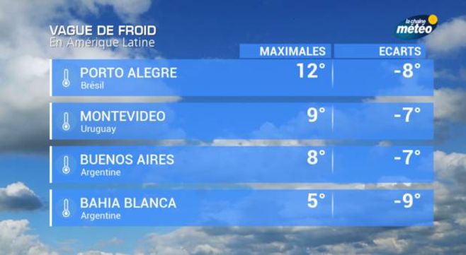 De fortes gelées concernent le sud du Brésil avec des valeurs proches de -2 à -5°C. L’après-midi, les maximales ne dépassent pas 8°C. Les températures accusent un déficit de 6 à 10°C par rapport aux normales. Ce froid s’accompagne d’averses de neige à très basse altitude entre Buenos Airès et Montévidéo.