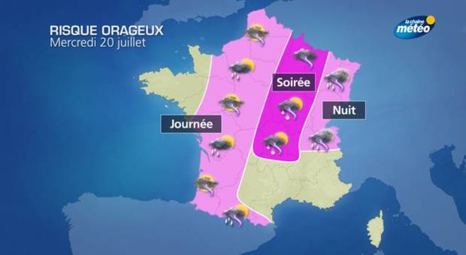 Enfin, le temps est particulièrement chaud dans le nord-est et le centre-est qui connaissent leur pic de chaleur durant cette journée. Toutefois, des orages finissent par éclater en fin d'après-midi et soirée de l'Auvergne au Luxembourg. Ils peuvent être localement forts et s'accompagner de grêle entre la Champagne, les Ardennes et la Meuse.