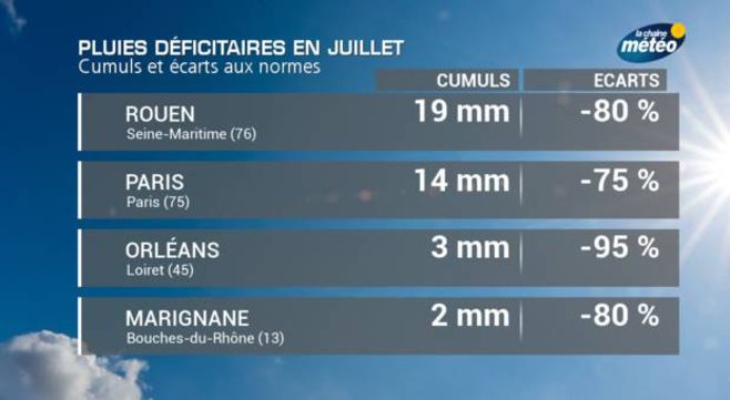 Ce temps très sec constaté depuis début juillet s'explique par la proximité de l'anticyclone des Açores qui rejette les perturbations sur les îles britanniques qui descendent ensuite vers l'Europe centrale et les Balkans. Cet anticyclone profite aux régions atlantiques qui bénéficient d'un très bon ensoleillement. Les pluies y sont très rares, Dans certaines villes, le déficit pluviométrique atteint 90 %. Le sud-est de la France, situé en bordure des perturbations qui contournent l'anticyclone des Açores, connaît également une sécheresse marquée, malgré les orages de samedi.