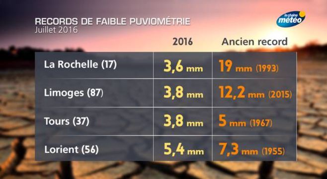 Dans un tel contexte météo, des records de faible pluviométrie ont été battus sur des villes comme La Rochelle (3,6 mm contre 21,6 mm en 1993), Tours (3,8 mm contre 5 mm en 1967), Limoges (3,8 mm contre 12,2 mm en 2015), Niort (5 mm contre 7,1 mm en 1967), Lorient (5,4 mm contre 7,3 mm en 1955), Nevers (6 mm contre 7 mm en 1949), Bourges (6,8 mm contre 7,1 mm en 1967).