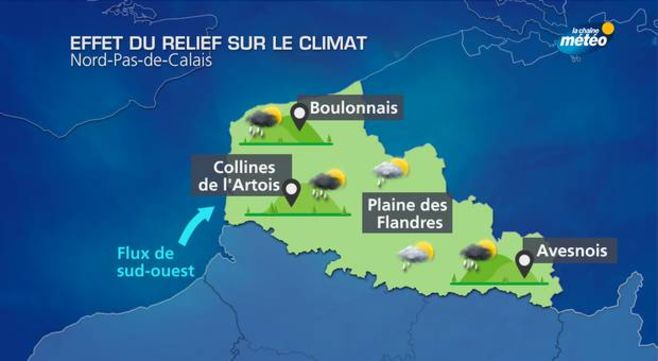 Les collines du Boulonnais et de l'Artois culminent à plus de 200 mètres d'altitude et sont directement exposées au flux de sud-ouest perturbé. Les pluies y sont donc copieuses lorsque ce régime océanique se met en place. De l'autre côté de ces collines, la masse d'air devient moins humide (assèchement par effet de foehn) et les précipitations sont beaucoup moins abondantes. Ainsi les 1er et 2 août, il est tombé 49 mm à Bainghen sur les collines du Boulonnais, contre 7 mm à Arras situé sous le vent des collines de l'Artois, à l'est de celles-ci.