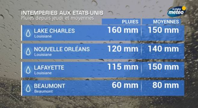 Samedi, il est tombé plus de 100 mm de pluie dans la ville de Lake Charles, c’est à dire l’équivalent de 3 semaines de précipitations en moins de 24 heures. Ces pluies survenant un sol détrempé par les orages des jours précédents ont provoqué des inondations dramatiques. Le bilan humain est lourd : il s’établit à trois victimes. Des centaines de maisons se retrouvent sous les eaux. En raison de la gravité de la situation, l'état d'urgence a été décrété dans l'ensemble de l'Etat, jusqu'au 10 septembre.