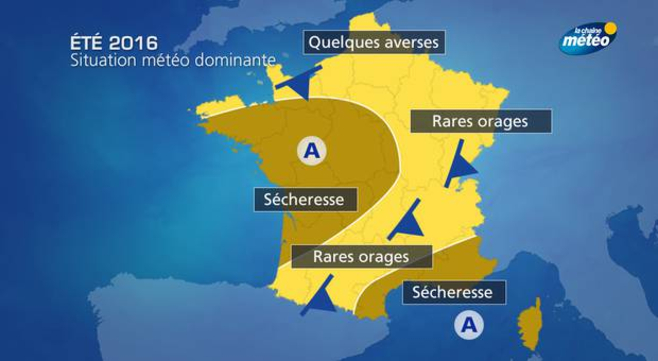 Au cours des mois de juillet et août, l'anticyclone des Açores a gonflé en direction de la France tandis qu'un puissant anticyclone s'est installé en Méditerranée. Il s'est donc crée une véritable barrière anticyclonique (on parle de situation de blocage en météo). Les perturbations océaniques n'ont circulé que sur le nord-ouest de l'Europe, débordant temporairement sur l'extrême nord de la France où la pluviométrie est proche de la normale, voire excédentaire sur la région lilloise. Quant aux dégradations orageuses, elles sont restées rares et n'ont pas été généralisées. Quelques orages ont circulé temporairement entre la région Midi-Pyrénées, le Massif-Central et les frontières de l'est.