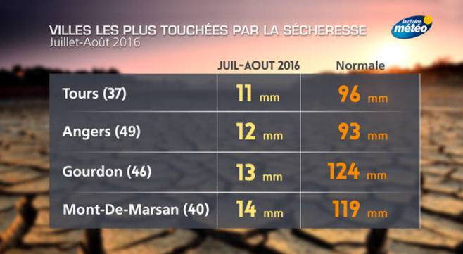 Avec une telle situation météo, les cumuls de pluie pour ces deux mois de juillet et août ont été déficitaires sur la majeure partie du pays. C'est dans l'ouest que la situation est la plus critique puisque le déficit sur l'ensemble de ces deux mois est de l'ordre de 80 à 90%. C'est le cas à Tours avec seulement 11 millimètres de pluie tombés en deux mois alors que la normale est de 96 mm. La situation est identique sur des villes comme Angers, Le Mans, Niort ou encore Mont-de-Marsan et Gourdon dans le sud-ouest. Il s'agit d'ailleurs de records de faible pluviométrie.