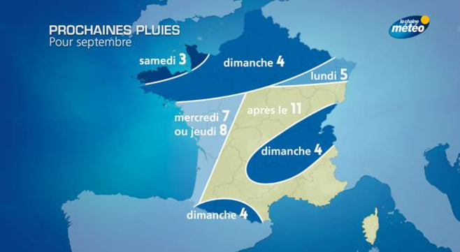Les mois de juillet et août ont été particulièrement secs sur le pays en raison de la persistance des conditions anticycloniques. C'est de l'ouest et du sud-ouest au centre que le déficit de précipitations est le plus important. On observe également une sécheresse importante sur les régions méditerranéennes même si cela fait partie intégrante du climat de ces régions en été.