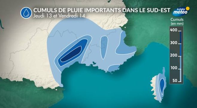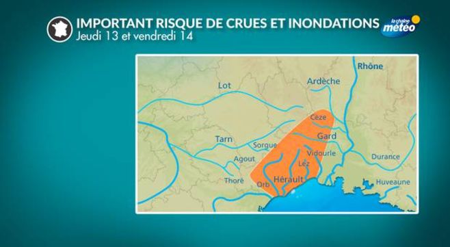 Le risque d'inondations s'annonce important, surtout sur le département de l'Hérault qui sera le plus exposé à cet épisode de près de 48 heures. Des cumuls de 150 à 200 mm sont attendus avec des pointes jusqu’à 400 mm. Ce type d'épisode avec plus de 200 mm en une journée survient en moyenne 1 fois tous les 1 à 2 ans sur le Languedoc et 1 fois tous les 2 à 5 ans sur les autres départements du sud-est.
