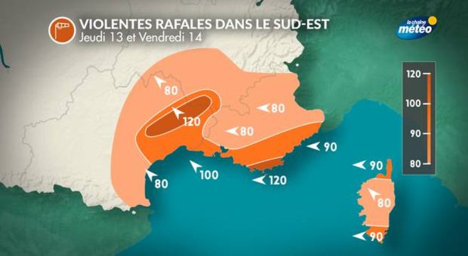 Les conditions seront également très dégradées en mer avec un vent puissant. Entre jeudi et vendredi, les rafales pourront souffler entre 100 et 120 km/h sur les côtes de Camargue, de Provence et du Var. Ce fort vent d'est à sud-est contrariera l'écoulement des eaux vers la mer et sera donc un facteur aggravant pour les crues des rivières du Languedoc. Par ailleurs, la houle sera importante avec de fortes vagues et un risque de surcote sur les côtes du golfe du Lion et du Var.