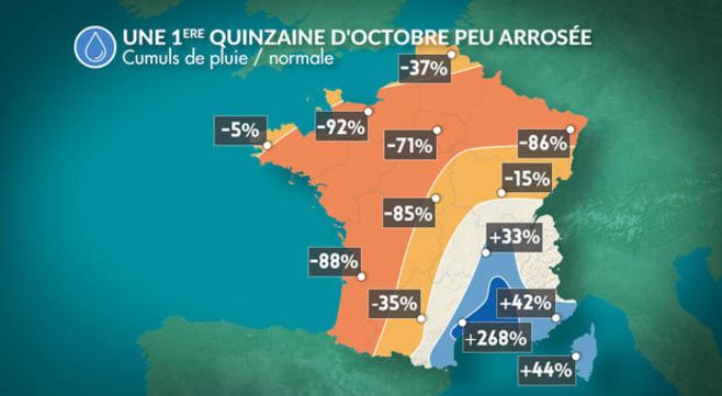 Seul le sud-est a bénéficié de précipitations abondantes au passage d'un épisode méditerranéen actif les 13 et 14 octobre. On a relevé jusqu'à 380 mm dans les Cévennes et 170 mm sur la ville de Montpellier, soit l'équivalent de deux mois de précipitations en 48 heures. Sur le nord et l'ouest du pays, les précipitations sont largement déficitaires sous l'influence des hautes pressions.
