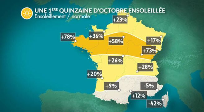Après un mois de septembre particulièrement chaud sur la France, on a retrouvé des températures beaucoup plus fraîches au cours de cette première quinzaine d'octobre avec l'arrivée des premières gelées en plaine. Les précipitations se sont montrées une nouvelle fois très déficitaires, à l'exception du bassin méditerranéen qui a connu un épisode pluvio-orageux actif.