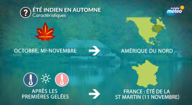 On l'a compris, la France n'a pas un climat propice à la survenue d'un véritable "été Indien" comme en Amérique du Nord. Cela dit, cette année pourrait déroger à la règle en nous offrant une belle période de temps sec et assez doux autour du 10 novembre : ce serait donc "l'été de la Saint Martin", qui s'annonce tout de même moins prononcé que l'année dernière : il avait fait jusqu'à 30°C au Pays Basque à cette même époque de l'année. Mais la différence est que cette année, cette période douce viendra après les premières gelées, qui se sont fréquemment produites en ce mois d'octobre : pour le coup, on pourrait utiliser à juste titre l'appelation "été Indien".