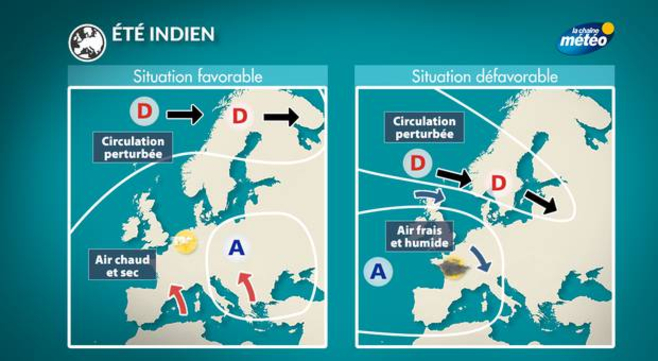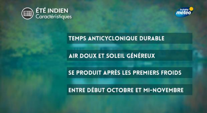 Si la saison automnale se caractérise par une diminution de l’ensoleillement et un retour progressif de l’air froid, l’été indien se produit lorsqu’un flux d’altitude lent entraîne un blocage de la circulation atmosphérique avec un anticyclone installé sur le continent. Les vents, qui sont établis au secteur sud, ont pour conséquence l’arrivée de masses d'air très douces, voire chaudes et de conditions stables. Ce temps agréable donne l’illusion de retourner dans une période estivale pendant quelques jours. Utilisée trop fréquemment, l’expression est souvent galvaudée et régulièrement utilisée pour parler des périodes d’ensoleillement tardives. En réalité, il faut que les températures soient supérieures d'au moins 5°C à la normale pendant plus de 3 jours, après l'apparition des premières gelées automnales. En France, les gelées sont plus tardives qu'au Canada et les variations de températures moins importantes. Le phénomène est donc plutôt rare. Joe Dassin aurait donc raison de chanter que l'été indien est "une saison qui n'existe que dans le nord de l'Amérique"... Chez nous, on parle plutôt "d'été de la Saint-Martin" (fêté le 11 novembre) et qui correspond à une belle période de temps doux et ensoleillé.