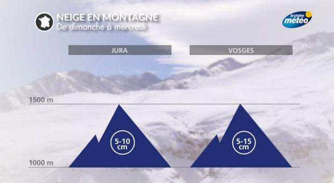A 1600 mètres d'altitude, on attend de 20 à 40 cm de neige sur le nord des Alpes et de 10 à 20 cm dans le sud des Alpes. Dans les Pyrénées, jusqu'à 30 cm de neige sont attendus sur les Pyrénées-Atlantiques et les Hautes-Pyrénées. Dans le Jura, la couche pourra atteindre 15 cm. Sur le Massif-Central, l'épaisseur se situera entre 15 et 30 cm de neige. Enfin dans les Vosges, on attend à 1200 mètres jusqu'à 15 cm de neige.