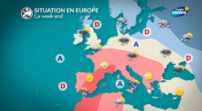 Les hautes pressions installées de l'Espagne à l'Europe Centrale garantissent encore un temps sec sur la majeure partie du pays samedi. Une perturbation atténuée arrivant par les côtes de la Manche ce soir traversera la moitié nord du pays dans la nuit et la journée de dimanche.