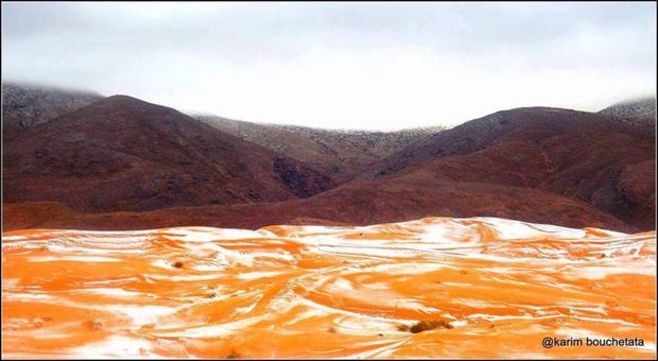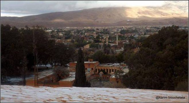 Cela étant dit, la neige n'est pas rare dans le désert, que ce soit en Algérie, au Maroc et en Tunisie, au-dessus de 1000 m d'altitude. Elle était tombée plus à l'est l'hiver dernier, et surtout lors de la vague de froid de février 2012. Le climat y est continental, hyper aride : plus que les températures, souvent froides l'hiver, c'est l'occurence de précipitations (pluie ou neige) qui reste rare dans ces régions.
