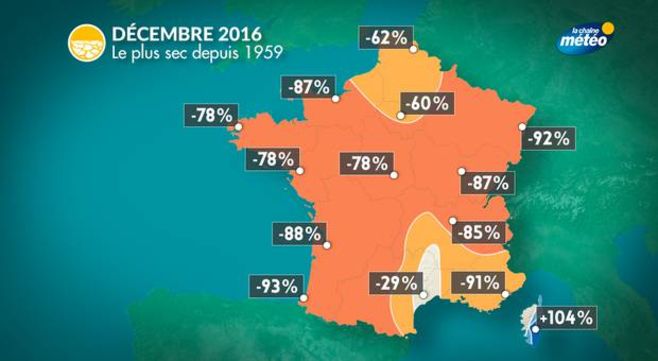 Si l'on excepte le Languedoc et la Corse, les précipitations ont été très déficitaires au cours des derniers mois. Les régions de l'ouest et du Centre, et dans une moindre mesure l'est de la France, sont particulièrement affectées par ce déficit pluviométrique. Après un automne déjà sec, le mois de décembre a connu un record de faible pluviométrie depuis 1959, année du début des relevés réguliers de précipitations sur un grand nombre de stations météorologiques. De nombreuses villes ont d'ailleurs battu leur record de faibles précipitations. C'est le cas à Colmar et Chambéry où il n'est pas tombé la moindre goutte d'eau (0 mm). Records aussi pour Tarbes (1,6 mm), Ambérieu (2 mm), Mulhouse (2,8 mm), Agen (4,2 mm), Auch (5,4 mm), Luxeuil (7 mm), Langres (7,4 mm), Saint-Girons (7,7 mm), Lyon (8,2 mm) et Limoges (15,6 mm).