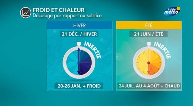 On peut se demander pourquoi la période la plus froide statistiquement intervient plus d'un mois après le solstice d'hiver (21 décembre) alors que les jours rallongent : c'est en raison du temps de réponse de l'atmosphère : il y a un délai de latence appelé "inertie", exactement comme en été, où la période statistiquement la plus chaude intervient fin juillet / début août. (notre illustration).