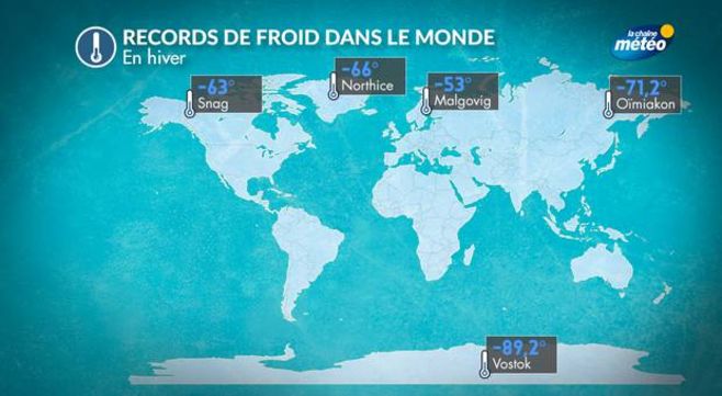 C'est à Oïmiakon, en pleine Sibérie que la moyenne des températures minimales est la plus basse avec -51,5°C en janvier. Dans cette commune de plus de 500 habitants, la température s'est abaissée à -71,2°C en janvier 1926 ! D'autres villes de Sibérie subissent des températures presque aussi rudes : Yakutsk avec une température moyenne de -43°C, Doudinka, au niveau du cercle polaire avec un ensoleillement très réduit au mois de janvier.