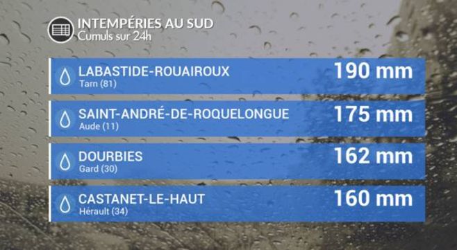 185 mm à Labastide-Rouairoux (81) 174 mm à à Saint-André- de-Roquelongue (11) 160 mm à Sauveterre (81) 145 mm à Rieusse (34) 127 mm à Dourbies (30) 112 mm à Maliver (12)