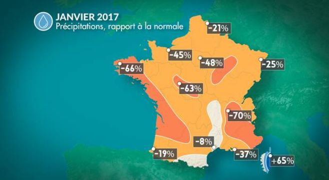 En moyenne sur la France, le mois de janvier 2017 présente un déficit de 2°C par rapport à la normale 1981-2010. Après un mois de décembre exceptionnellement sec, ce mois de janvier est lui aussi peu arrosé avec un déficit de 50% de précipitations. L'ensoleillement a été généreux avec un excédent de l'ordre de 20%.