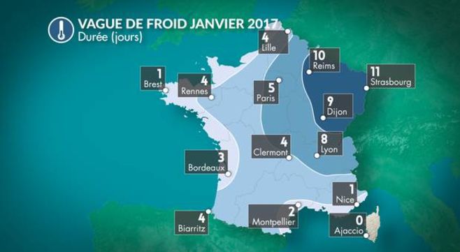 La période de grand froid survenu entre le 17 et le 26 janvier a été de courte durée et d'assez faible intensité dans l'ouest, plus durable et d'intensité modéré dans l'est. C'est dans le nord-est sur les sols enneigés qu'on a relevé les températures les plus basses avec -15° à Colmar, -16° à Luxeuil et localement -20°C dans les combes du massif du Jura. Dans l'est on a enregistré plusieurs jours sans dégel l'après-midi. Belfort détient la palme du froid avec jusqu'à 12 jours consécutifs sans dégel!